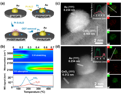 本工作通过两种不同的策略将Pt引入到Au/CeO2表面。其中一种是直接将Pt沉积在Au/CeR催化剂上,所得样品被标记为Pt@Au/CeR;作为对比,另一种策略是通过选择性原子层沉积方法使用ODT作为阻挡剂选择性地将Pt选择性的沉积在CeO2纳米棒(CeR)载体上,所得样品被标记为Pt+Au/CeR。相关表征结果表明,Pt在Pt@Au/CeR中分布于Au和CeR载体上,而Pt+Au/CeR中Pt和Au纳米粒子的空间关系完全不同,Pt+Au/CeR中Pt分布在CeR载体表面,而不是Au纳米粒子表面。