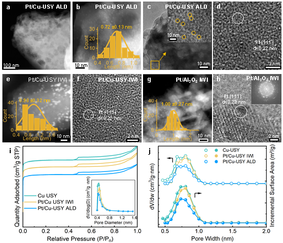 通过HAADF-STEM和HRTEM(图2)直接观测到,采用ALD技术在150 °C下沉积的Pt团簇平均尺寸仅为0.72 nm,且均匀分布在USY沸石内部。氮气吸附-脱附等温线分析进一步证实,Pt负载后催化剂的比表面积和微孔体积显著下降,这表明Pt团簇被成功限制在沸石的微孔道内,为串联反应提供了理想的纳米反应器。