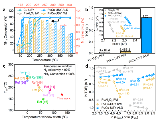 如图3所示,在模拟真实尾气条件的评价中,Pt/Cu-USY ALD催化剂展现出优异性能:NH3的50%转化温度低至170 °C,远优于对比样品Pt/Cu-USY IWI的196 °C。更为重要的是,其N2选择性在170-300°C的整个区间内均保持在90%以上。动力学分析表明,其周转频率高达1.25 s-1,本征活性显著提升,且对NH3的反应级数接近于零,显示出优异的抗NH3和NO中毒能力。