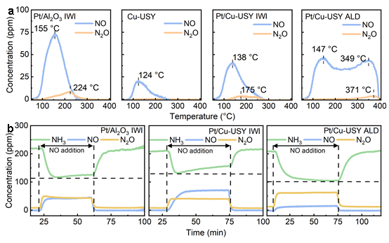 原位DRIFTS研究为研究NOx物种的储存提供了关键证据,如图5所示。在反应条件下,传统的Pt/Al2O3 IWI和Pt/Cu-USY IWI催化剂表面主要积累自由硝酸盐物种,这些物种会毒化活性位。而Pt/Cu-USY ALD催化剂的表面则主要由N2O4和NO+物种主导。这些物种的形成能垒更低,且不易导致位点中毒,从而在低温下高效存储NOx,并在升温后参与后续反应。
