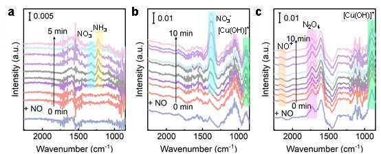 图4(a)中NO-TPD实验发现,Pt/Cu-USY ALD催化剂在349 °C出现了一个独特的强NO脱附峰,这表明限域效应极大地增强了催化剂对NO的吸附能力和作用强度,有利于NO在高温下被进一步转化,而非直接脱附导致选择性下降。图4(b)中NO干扰实验表明,NO会促进Pt/Cu-USY ALD催化剂表面的i-SCR反应,而不是毒化Pt位点。