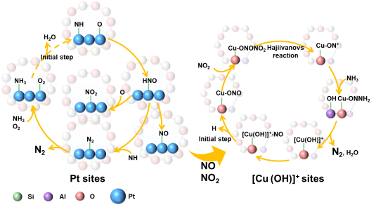 基于所有实验证据,研究团队绘制出清晰的反应路径,如图6所示。该图阐明:限域在超笼内的富电子Pt团簇负责高效活化NH3并生成NOx中间体;这些中间体被优先转化为N2O4/NO+,并迅速迁移至相邻的[Cu(OH)]+位点;随后,在Cu位点上发生快速的内选择性催化还原反应,将NOx与NH3直接转化为N2和H2O。这种空间上限域耦合、功能上协同串联的机制,是同时攻克低温活性与高温选择性难题的关键。