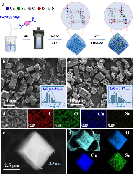 研究的关键在于精密的控制。通过调节“原子层渗透”的循环次数,团队实现了Sn原子在骨架中的均匀分布,同时完美保持了材料原有的形貌(图2)。最优化的样品被称为7SnCuBDC。