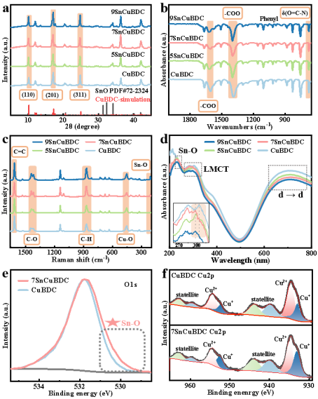 为确认“分子精装修”的效果,研究团队对材料进行了一次系统性“体检”。多种表征手段(图3)共同证实:Sn-O物种已精准引入CuBDC孔道中,材料的晶体骨架保持完整,并成功构建出Cu-O-Sn新键。孔隙分析也显示结构发生了合理调整,印证了Sn-O活性簇的成功植入。结合理论计算进一步表明,该方法能稳定形成Cu-O-Sn-O-Sn-O-Cu活性中心。这些结果共同说明,活性位点已被精准构筑于骨架之中,为其优异的催化性能奠定了扎实的结构基础。