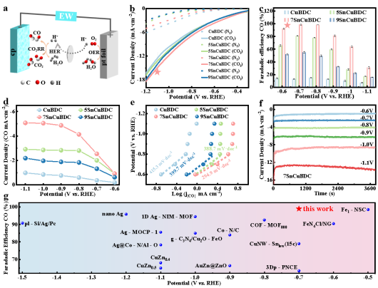 理论计算进一步描绘了详细的反应蓝图(图7):CO2分子被Sn位点“抓住”并稳定吸附,经过几步高效的质子-电子传递步骤,最终转化为CO并成功释放。整个路径在Sn-O-Sn位点的调控下变得更为顺畅。