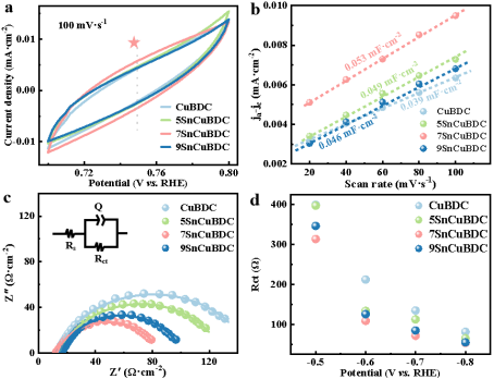 为什么会有如此显著的提升?研究团队通过一系列深入的机理研究揭示了奥秘(图5)。新引入的Sn-O-Sn单元扮演了多重角色:首先,它优化了材料内部的电子传导能力,让反应更快进行;其次,它增加了催化剂的“有效工作面积”,提供了更多的反应位点。