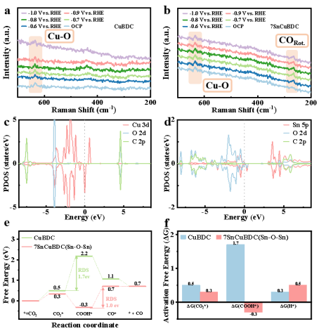 实验观测与理论模拟进一步揭示了该机理。原位光谱监测捕捉到了反应中形成的Sn‑CO中间体信号,如同找到了化学反应中的“关键证人”,直观证明了活性位点在催化过程中能够稳定发挥作用。计算模拟进一步显示,Sn‑O‑Sn位点能更牢固地吸附CO2,并将关键中间体COOH*的生成从“需耗能”转为“可自发释放能量”,同时抑制了H2的产生。电子结构分析(PDOS)还表明,Sn与CO2中的氧形成了强效电子协同,显著提升了CO2的活化效率。