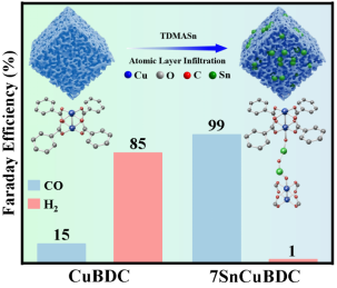 研究团队采用的ALI技术,犹如在既有的建筑框架内进行原子尺度的“精装修”。他们在一种名为CuBDC的铜基多孔骨架中,成功植入了Sn原子,构建出独特的Cu-O-Sn-O-Sn-O-Cu活性结构。这种结构就像在材料内部设计了一个个微型的“分子捕碳笼”,能够更有效地捕获并转化CO2(图1)。